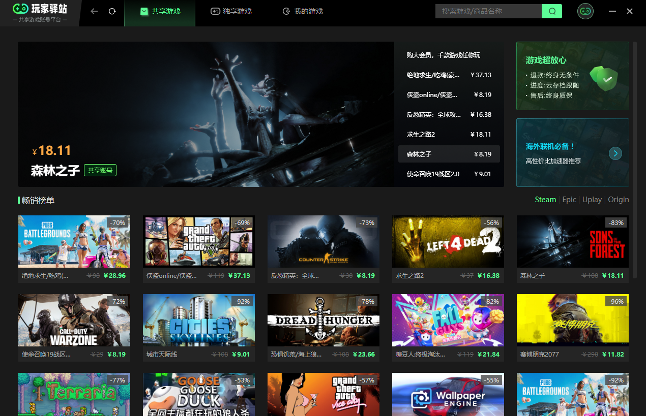 玩家驿站是一个玩家一站式的游戏综合体验平台,隶属于四川精诚智达网络科技有限公司,用户可在平台内,购买游戏账号、cdk或游戏周边产品,如用户购买的是共享服务,可直接通过平台启动游戏。平台售卖游戏包括steam、uplay、origin、战网等海外网游联机平台游戏。目前,玩家驿站已经为百万玩家提供服务。作为一家专业的游戏综合服务商,玩家驿站致力于重塑并优化产业生态及服务形式,专注研发行业应用和链接业内游戏资源。玩家驿站会不断进化,提供更有竞争力的服务,为所有热爱游戏的玩家带来更爽快的体验。玩家驿站拥有强大的客服、售后以及技术团队,为用户提供丰富的服务,并保障账户安全。
