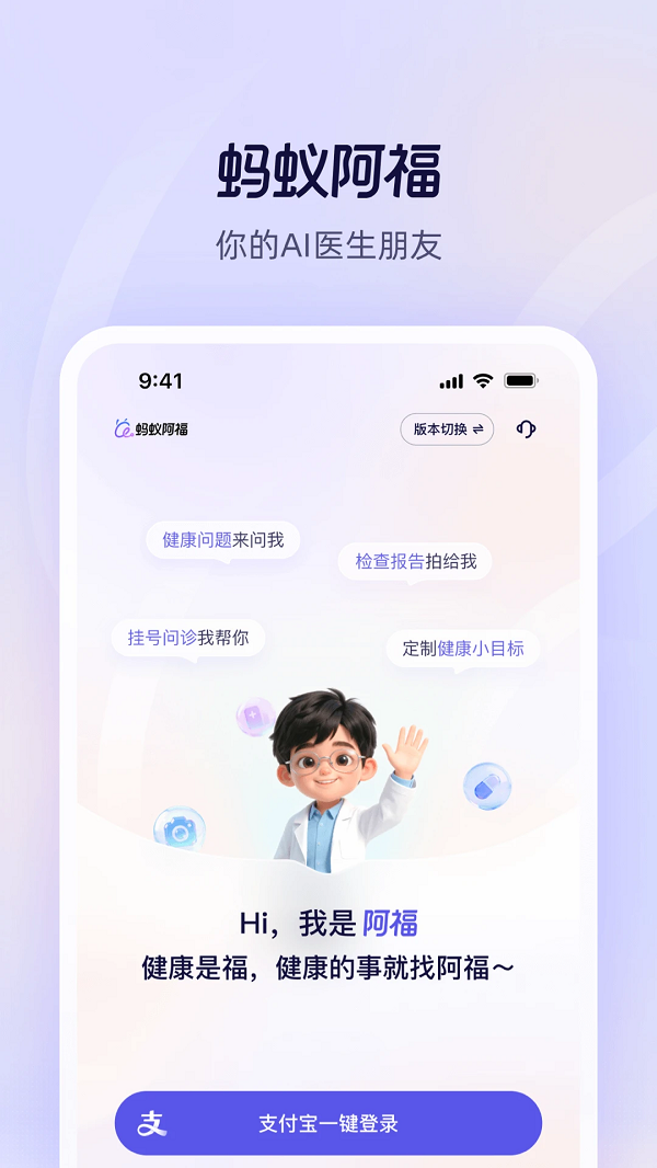 蚂蚁阿福app是蚂蚁集团开发和运营的医疗健康ai应用,为用户提供各类健康咨询、图片解读(报告、病例、处方、药盒均支持)、个人和家庭健康档案管理及各类医疗健康服务,如预约挂号、云陪诊等。