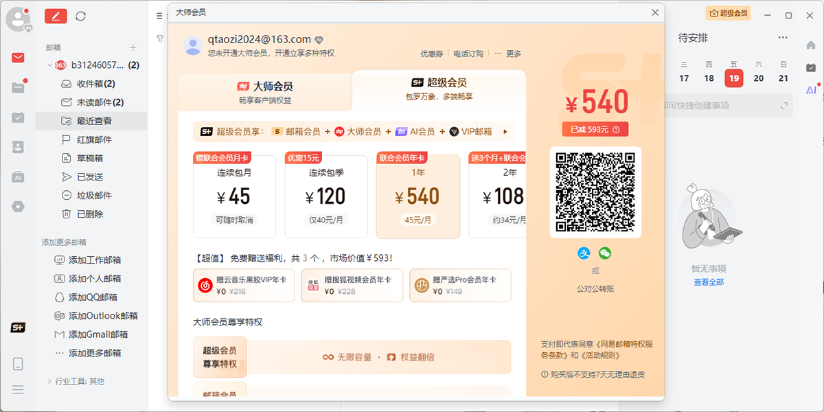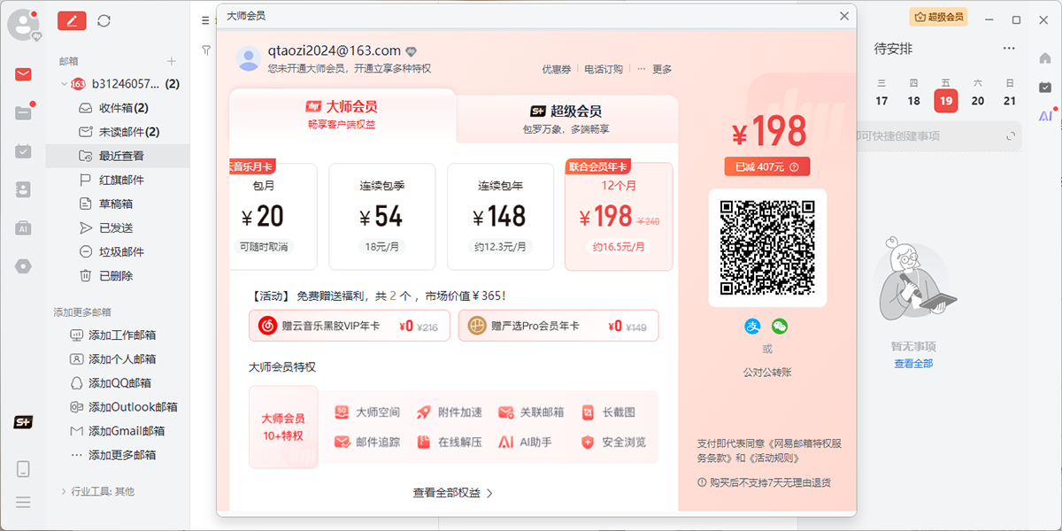 网易邮箱大师电脑版是免费软件,提供基础功能的免费使用。部分高级功能如云附件无限制发送、更大云存储空间等可能需要会员服务,但核心邮件管理功能完全免费