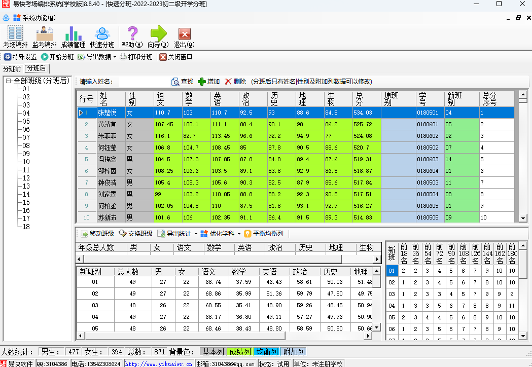 四、快速分班:可实现按成绩平衡分班、随机分班、按成绩高低“之”字形分班等多种分班,分班时可按制各班男女人数平衡,可平均各班人数,可也自定各班人数。分班后,可查看分班后各科平均分,可手工调整分班数据,导出分班数据。