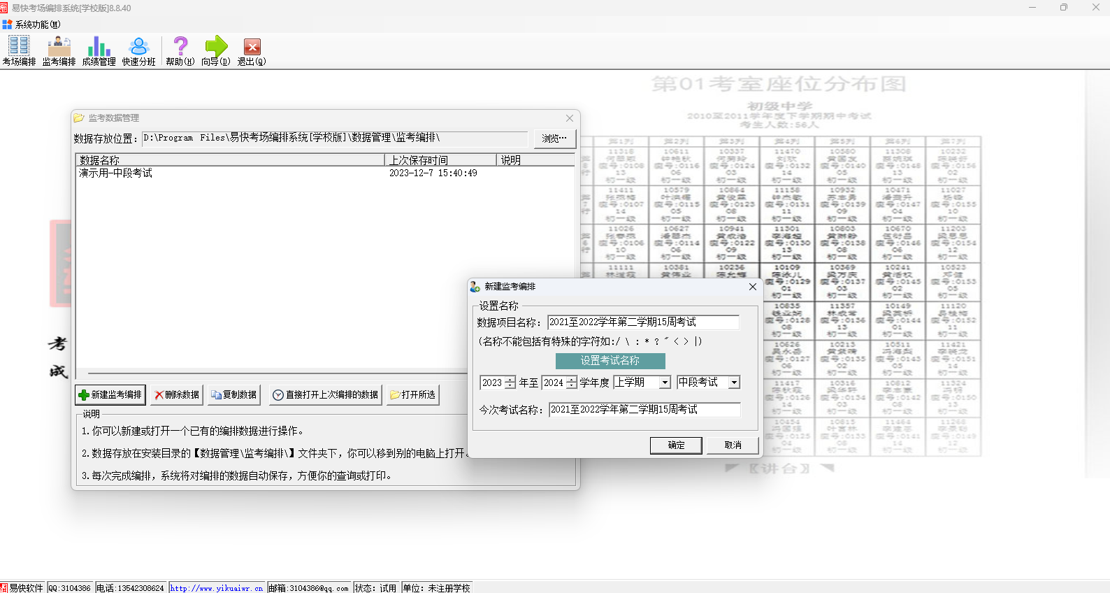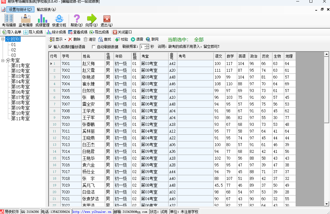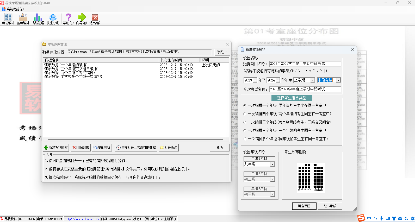 易快考场编排系统[学校版]具备考场编排、监考编排,成绩管理、快速分班等功能,支持多种形式编排,如多年级混合,文理科混合等编排;各考室人数自由设置,编排方式多样,输出报表丰富,如支持座位分布图输出,考生相片输出,各种编排数据分类输出等报表。