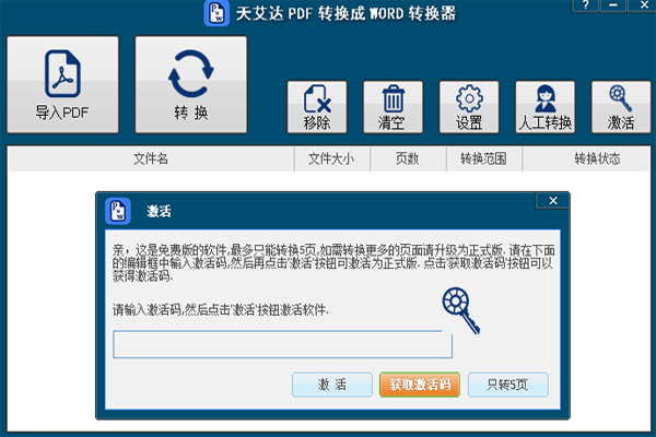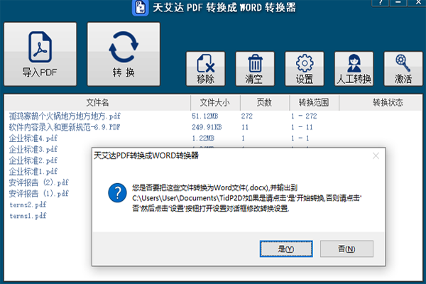天艾达pdf转换成word转换器是一款集pdf转word、pdf转txt、pdf转jpg等多种pdf转换功能于一身的基于windows平台的专业pdf转换工具软件,该软件主要用于把pdf转换成word,txt文本文件,jpg图片文件等其他格式的文件,软件支持批量转换,用户可一次性导入一个或多个pdf,然后让软件按次序一个个自行转换,如此可为用户节省不少时间,该软件使用简单,易于操作,然而功能却十分强大,是一款不可多得的专业级别的pdf转换工具软件。