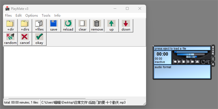 pam是一款mp3播放程序,可套用skin更换面板,支持playlist、id3编辑及lyricstag编辑,且内含屏幕保护程序、可于使用装置时播放mp3音乐。支持格式包括:mp3、mp2、mpa、wav、aif、aifc、aiff、au、snd、mid、rmi、m3u playlist等。