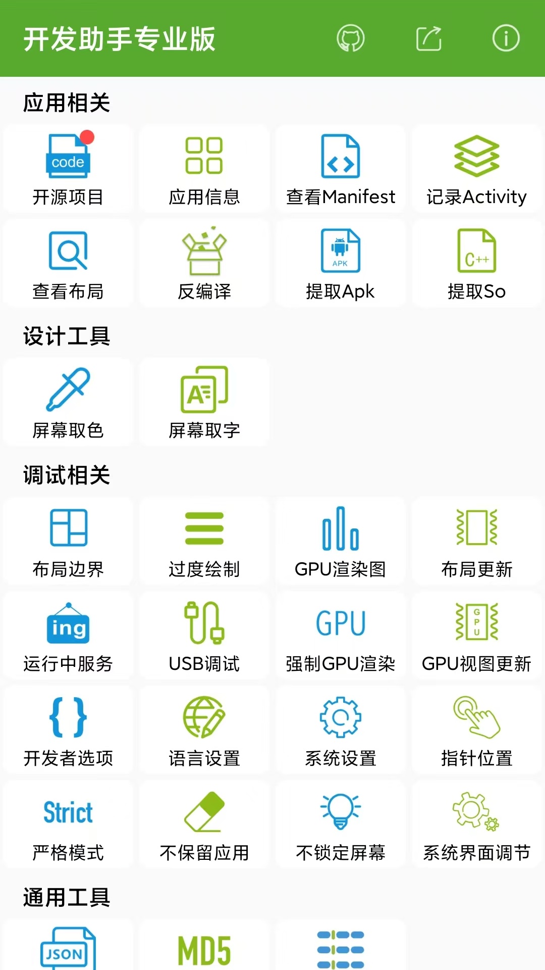 开发助手是个强大的 android 开发工具,能够用来反编译其他应用、查看其他应用布局和控件信息、屏幕取色(颜色取样器)、查看 activity 历史记录、查看其他应用 manifest、查看最近使用和最近安装的应用、提取任何应用 apk 和 so 文件、查看最近开源项目、调试应用、查看手机软硬件信息等,后续会添加更多功能。具体功能如下: