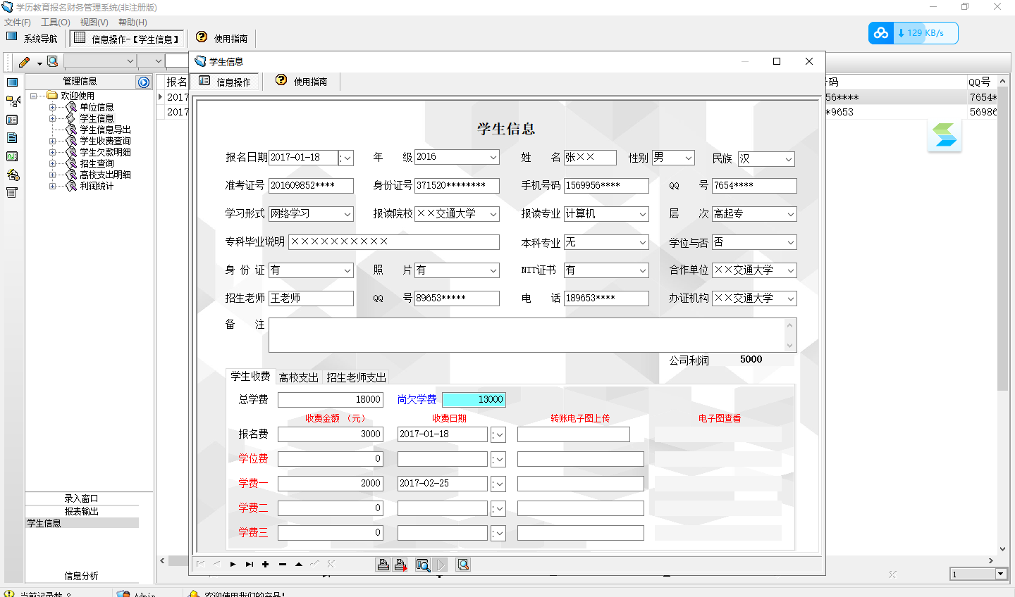 主表:报名日期 年级 姓名 性别 准考证号 身份证号 手机号码 qq号 学习形式 报读院校 报读专业 层次 专科毕业说明 本科专业 学位与否 身份证 照片 nit证书 合作单位 招生老师 招生老师qq 电话 办证机构 备注 学生总学费 报名费用 报名费交费日期 学位费 学位费收费日期 学费一 学费一收费日期 学费二 学费二收费日期 学费三 学费三收费日期 尚欠学费 高校总学费 第一次付款 第一次付款日期 第二次付款 第二次付款日期 第三次付款 第三次付款日期 欠款 招生老师总费用 已付经费一 付经费一日期 已付经费二 付经费二日期 公司利润