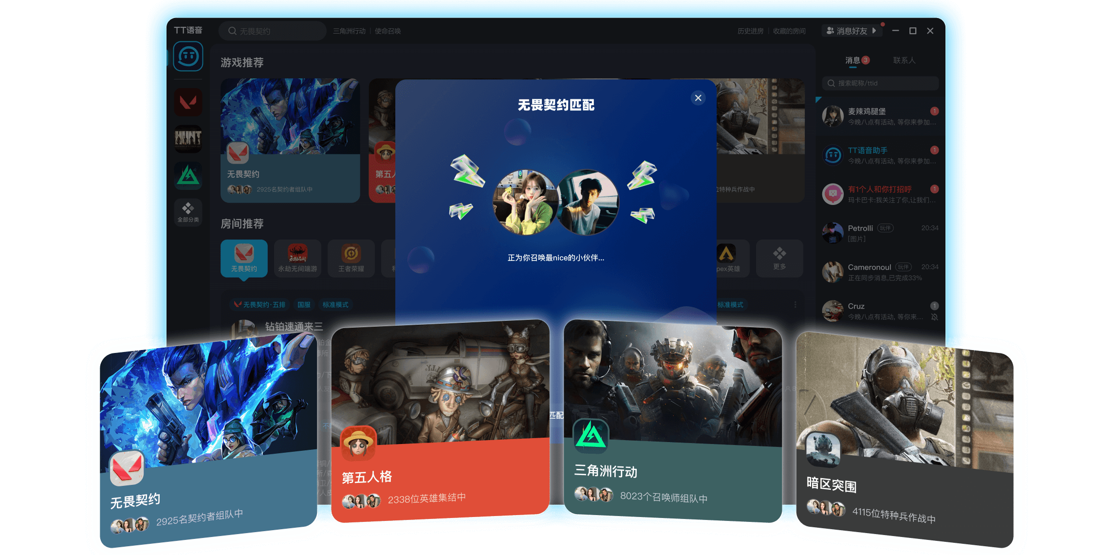 tt语音,以游戏互动为主的兴趣社交平台,超1亿年轻人都在用!为你提供组队开黑、线上k歌、玩伴扩列等时下流行的社交组局玩法~上tt,随时有玩伴!