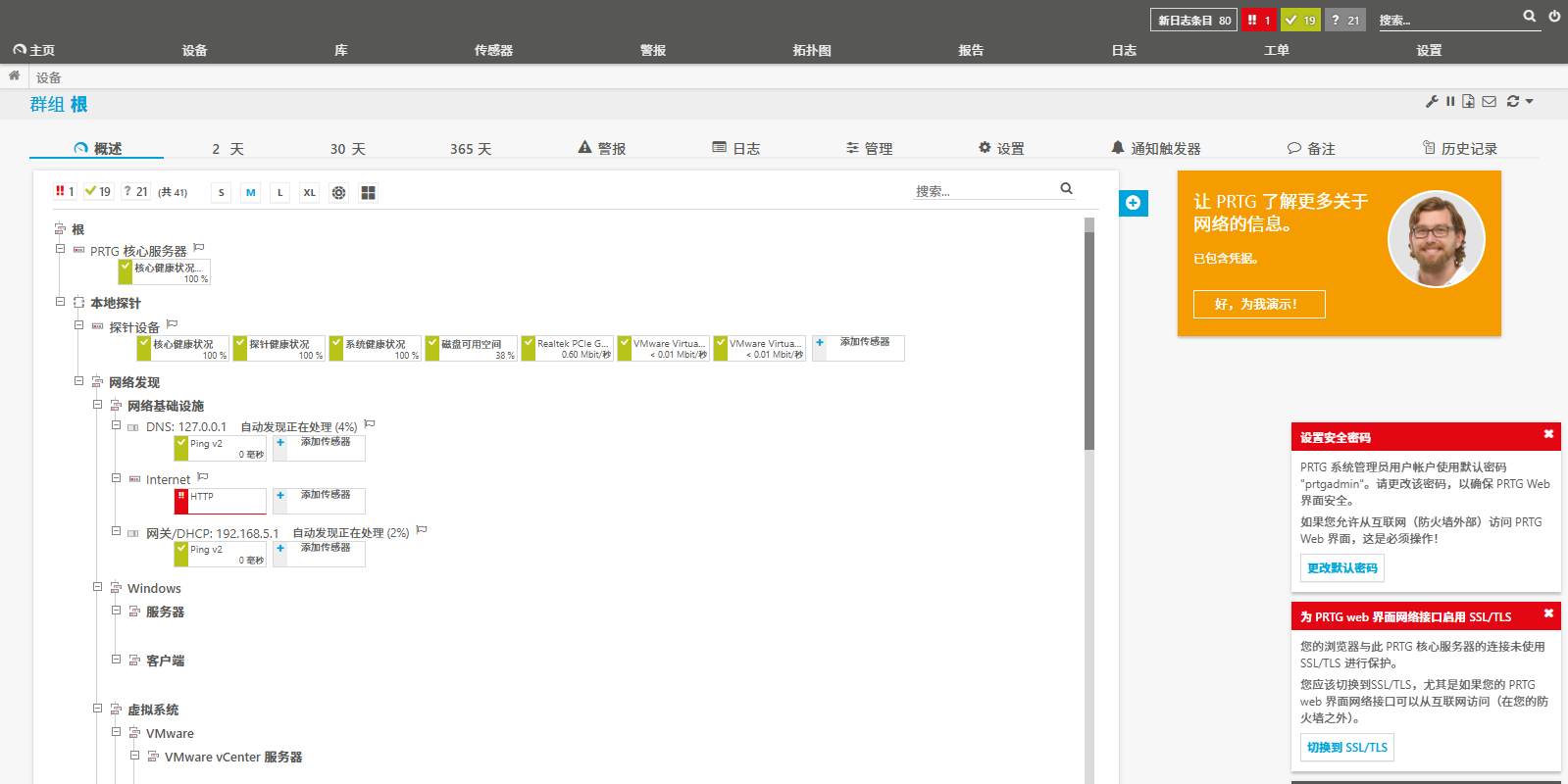 prtg network monitor是一款先进易于使用的网络监控解决方案,密切关注所有系统、设备、流量等,高灵活性以及it、ot和物联网基础设施的轻松可扩展性,直接在专用服务器上的it基础架构中运行,完全访问您的配置和数据,拥有高度可定制的警报、通知和报告,适用于主流供应商的预配置监控和设备模板。