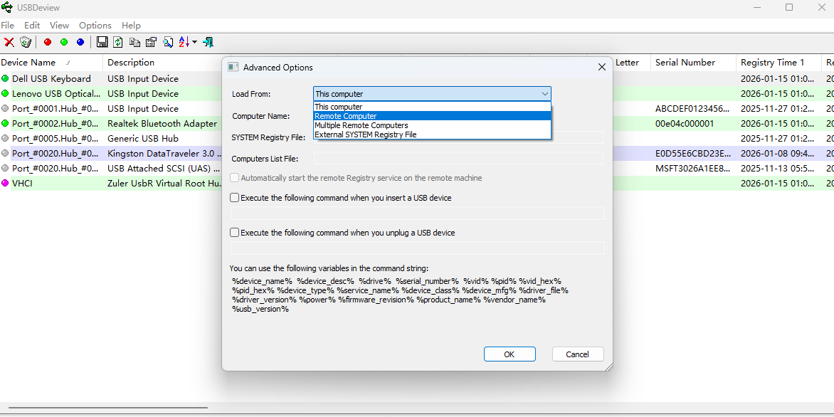 4 可以在usb设备连接后运行指定程序(即使自动运行功能被禁用),usbdeview可以使用特定变量,如%device_name%, %device_desc%, %drive%, %serial_number%, %vid%, %pid%等