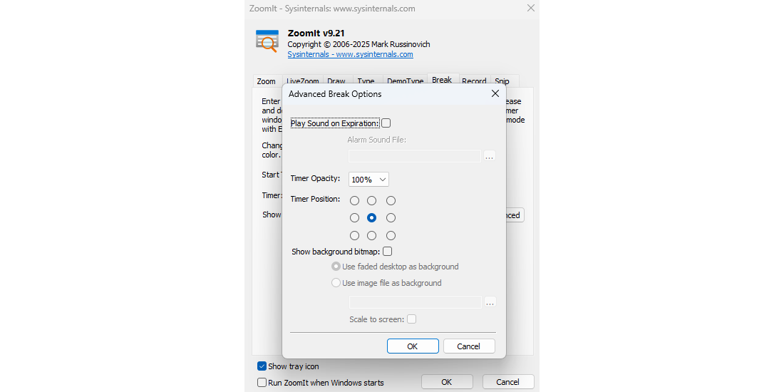 zoomit是一款实用的简报工具。主要提供3项功能:第1项是缩放屏幕比例的功能,当屏幕上有某块区域或图标您想要特别强调时,可以利用此功能进行展示。第2项是注释功能,可以和缩放屏幕比例的功能一起使用。第3项是定时器功能,使用此功能时会暂时将桌面利用白色屏蔽覆盖,并在白色屏蔽上出现倒数计时的时间,您可以选择倒数计时时间的长短、倒数计时结束后是否要播放警告音效、白色屏蔽透明度、倒数计时时间显示在屏幕上的那个位置。