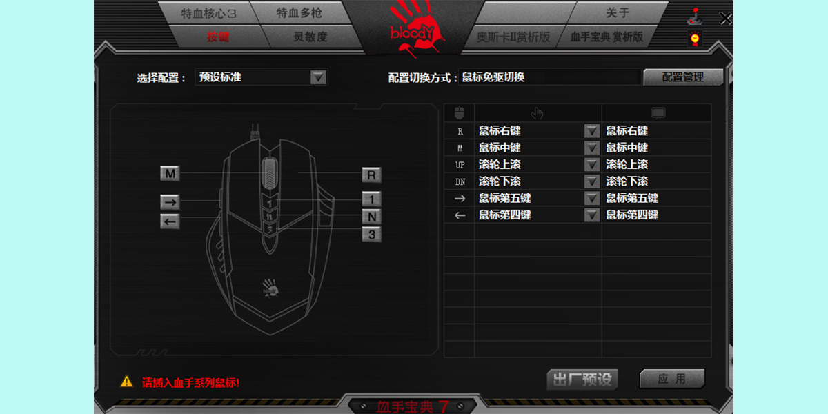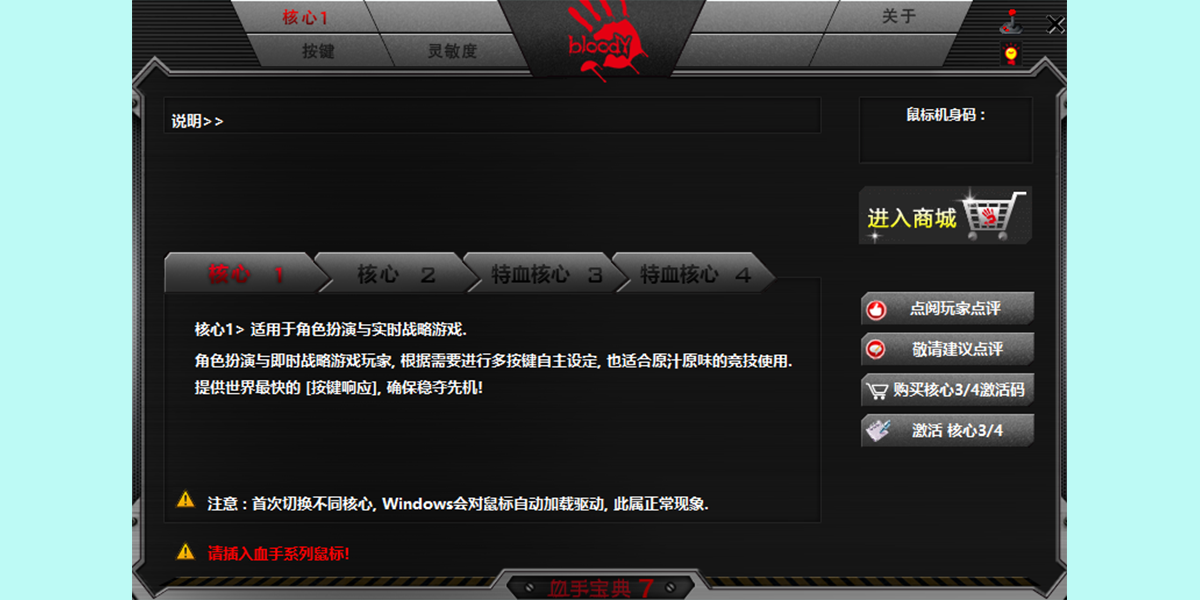 1、血手宝典共4个核心,除了早有的前3个核心,增添了宏秘核心4。核心1适用于rts以及mmo游戏,玩家可对按键进行自主设定,核心2适合于初级fps设计游戏,特学核心3适合中高级fps游戏,宏密核心4更加适合moba游戏私用。鼠标滚轮后的四个档位分别对应了射击次数,最多为4连射。