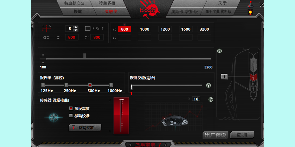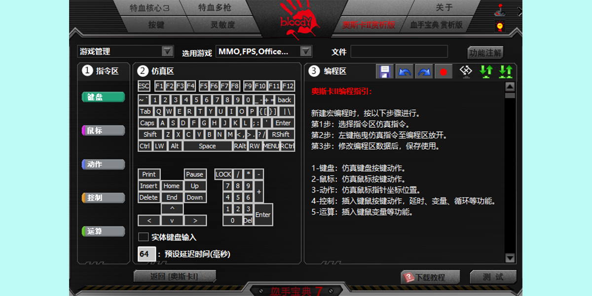3、特血核心3的驱动调节在档位、按键、灵敏度上都没什么变化,唯一变化的是档位调节的名字改为了特血多枪,此外还增加了奥斯卡宏以及血手宝典两个驱动调节界面。在奥斯卡宏里玩家可以随意的建立适合自己的宏,奥斯卡宏的调节比较复杂,可以说是真正的鼠标编程驱动,在奥斯卡宏中玩家可以设定鼠标的轨迹、转角、按键的时间等等,然后再将之用于游戏。在血手宝典中,玩家可以找到已经设置好的配置文件,免去了许多的麻烦。