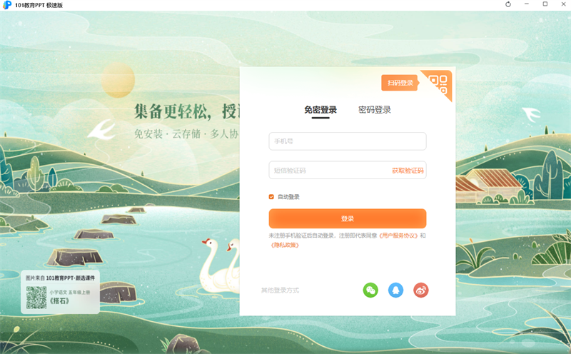 101教育ppt极速版,专为教师群体倾心打造的一体化教学软件,无缝衔接备课与授课流程。其功能丰富多元且极具针对性,一方面,有力支撑ppt课件的高效制作,同时配备海量教学资源、多元互动工具以及专业学科工具,全面覆盖教学需求;另一方面,贴心提供多端录课、云端存储等实用功能,贴合教学日常。尤为便捷的是,手机端与电脑端协同运作,教师可远程精准操控 ppt,借助手机拍照、摄像功能即时投屏,轻松达成走动教学模式,让教学空间得以拓展,教学方式更为灵动,切实助力教师备课省心省力、授课高质高效。