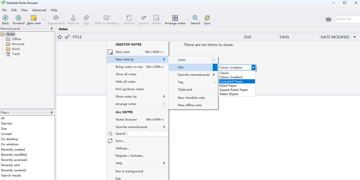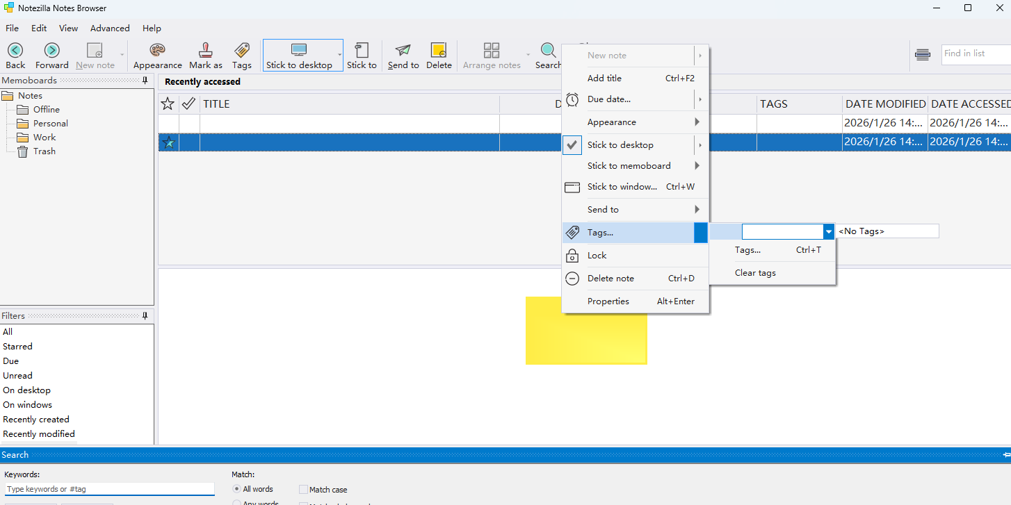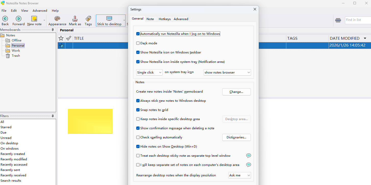 notezilla是一款快速、灵活的windows记事软件,如同使用普通的纸制3m便利帖一样快速记笔记,可以在桌面上创建虚拟便签,记录想法、待办事项、备忘录等信息,软件支持各种自定义选项,如颜色、尺寸、字体等,用户可以根据个人喜好进行设置,notezilla还有便捷的搜索功能和备份选项,确保用户的笔记安全可靠,用户还能在不同设备间同步笔记,随时随地访问自己的信息。