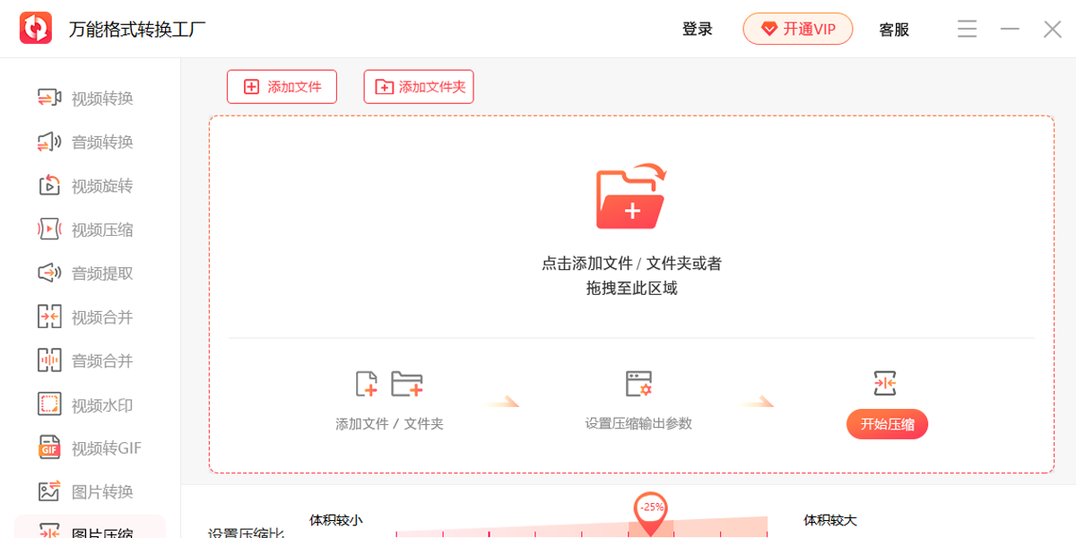 一键导入、一键压缩:通过添加文件夹的方式,批量导入图片;通过设置压缩比,直接调节文件大小