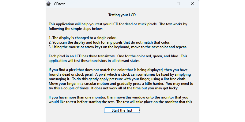lcdtest是一款液晶显示器坏点检测软件,可以测试屏幕上是否存在亮点、暗点或色彩显示不匀等瑕疵,需要注意的是lcdtest只能识别lcd背面或卡住的像素,它无法修复显示器。