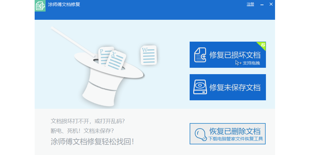 涂师傅文档修复最新版是一款操作简单、界面简洁的文本处理软件,涂师傅文档修复官方版可以修复已损坏文档,找回未保存文档,找回已删除文档。而且不会对原文档造成二次损坏,文档损坏是一般用户在进行文档操作的过程中经常遇到的情形,涂师傅文档修复能帮你解决这种问题。