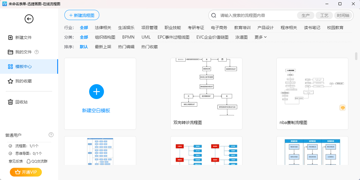 支持自定义绘制的同时迅捷画图还提供了1600+个流程图模板涵盖了各个领域,点击即可一键套用,让绘制难度大大降低。