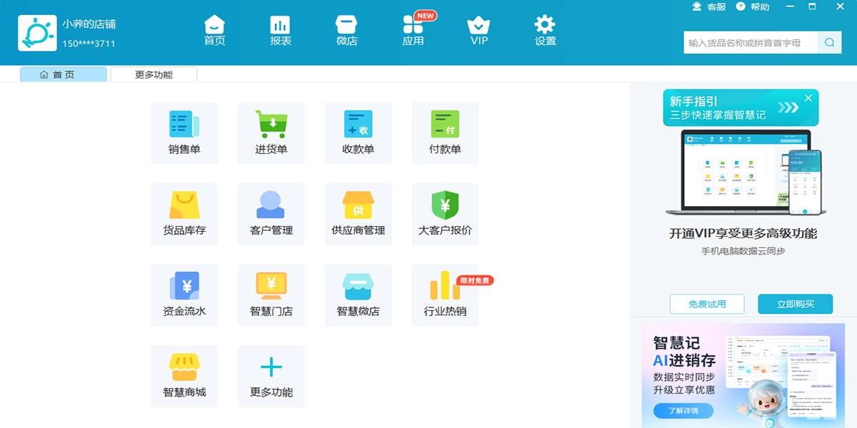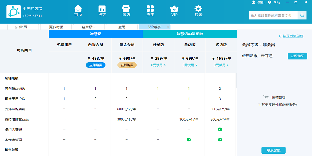 进销存基础功能免费使用,多店铺多店员可按需开通vip。