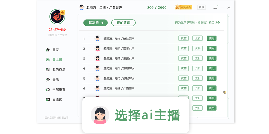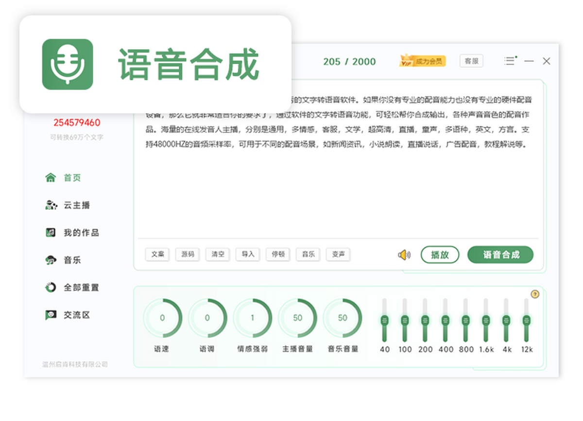 根据自己的需要选择,你所喜欢的ai主播和背景音乐,并调整好语调,语速,人声音量,音乐音量,变声处理及均衡器等参数。