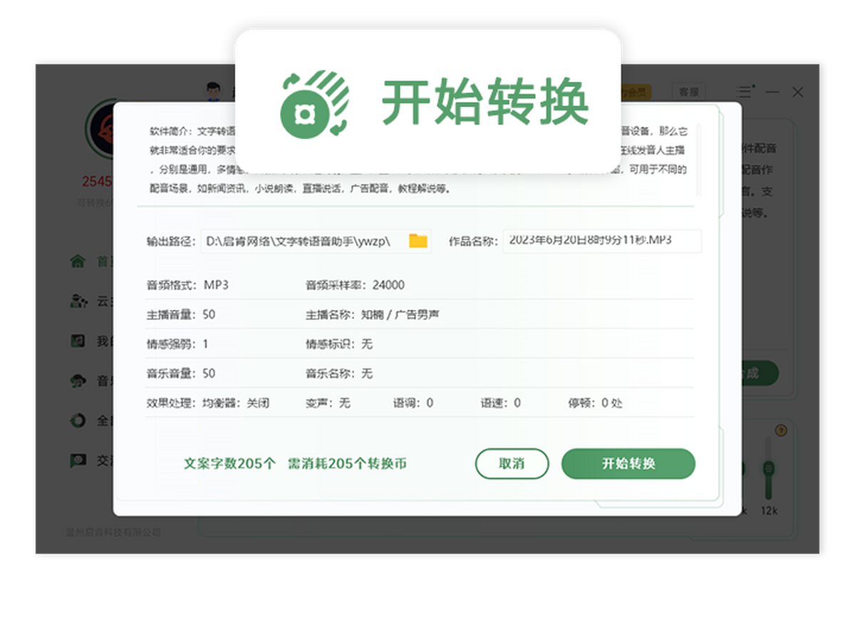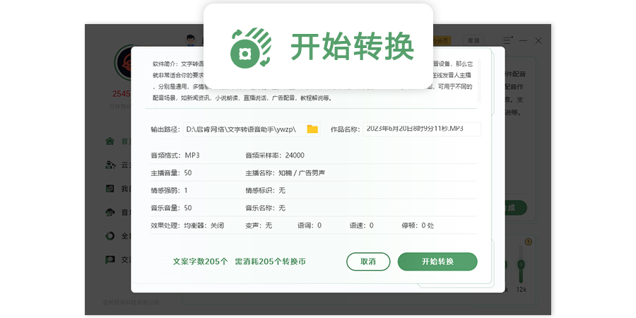 广告配音王是一款优秀的文字转语音软件,通过软件的文字转语音功能,可轻松帮你合成输出,各种声音音色的配音作品。海量的在线ai发音人主播,分别是通用,多情感,客服,文学,超高清,直播,童声,多语种,英文,方言。支持48000hz的音频采样率,可用于不同的配音场景,如新闻资讯,小说朗读,直播说话,广告配音,教程解说等。