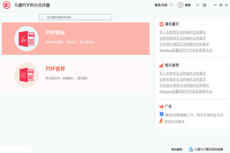 九雷pdf拆分合并器,专为pdf拆分和pdf合并设计。可按页对pdf进行拆分和合并操作。提供三种拆分模式,两种合并模式。可批量处理,方便快捷。
