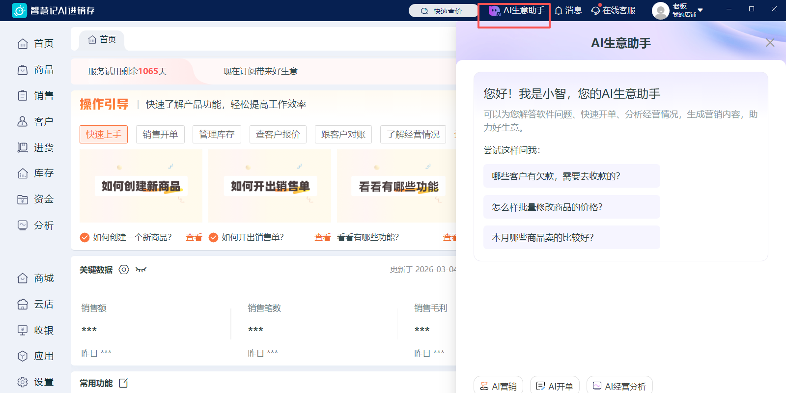 一、智慧记ai进销存,帮你开单管账出主意