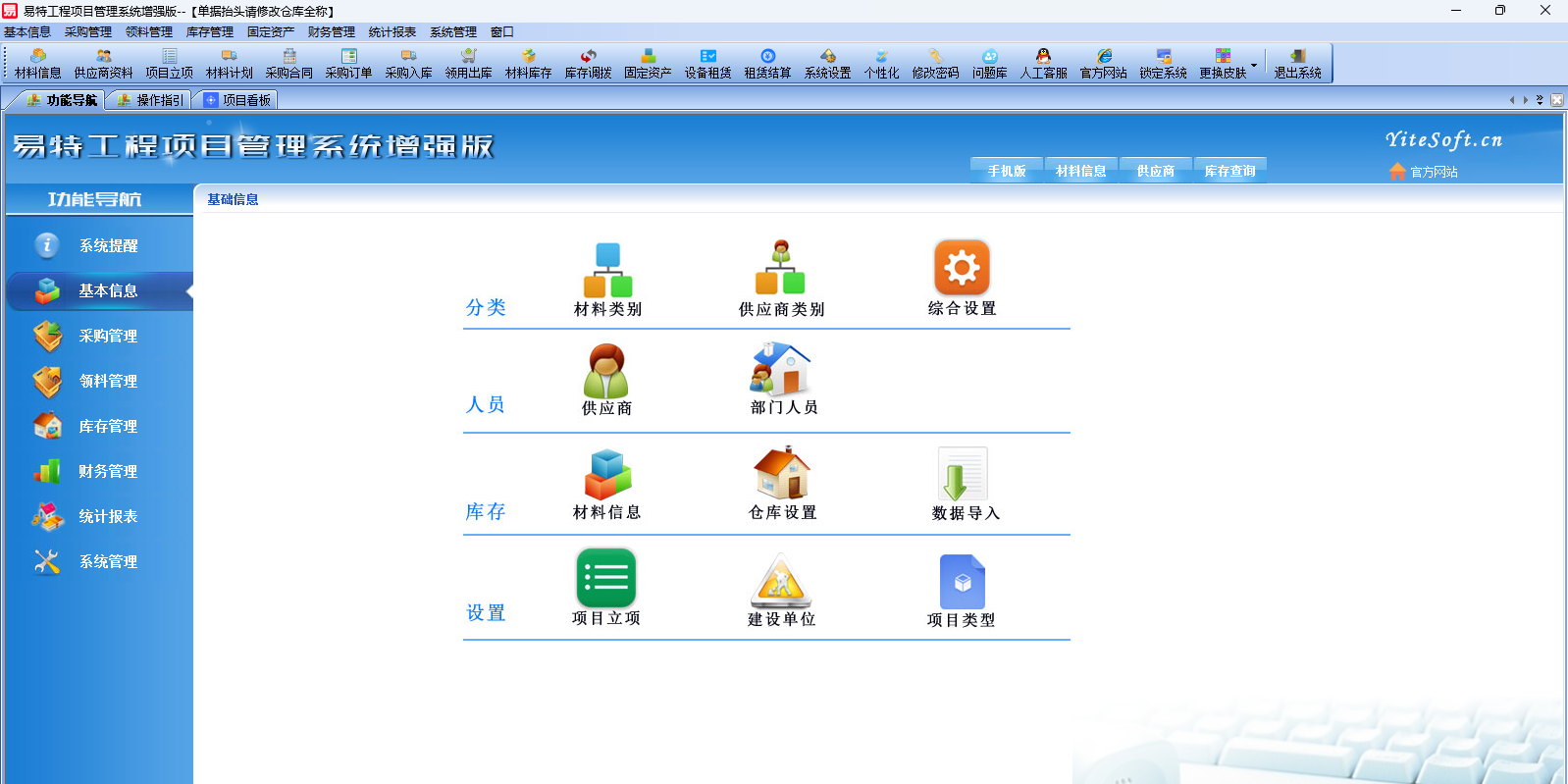 材料信息,供应商,材料分类,项目立项,仓库等基本信息的设置;