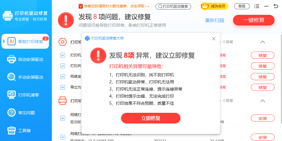 常见打印机错误、驱动问题一键修复