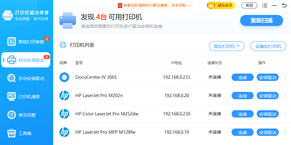自动识别打印机驱动,高速下载一键安装