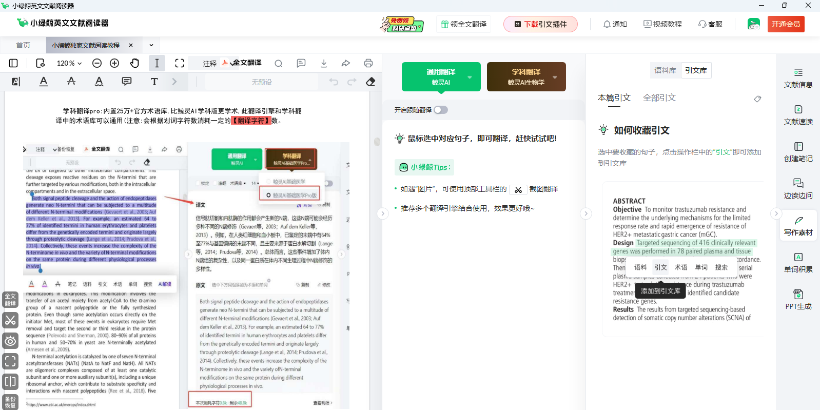小绿鲸英文文献阅读器——专注提高sci阅读效率,是一款专注提高英文文献阅读效率的云端阅读软件,超176万科研人都在用,支持电脑、pad和手机同步阅读,读sci更轻松。集翻译、文献管理、笔记、ai解析、汇报ppt等功能于一体,针对【选题、做实验、写论文、文献汇报】四大场景设计了专业的解决方案。