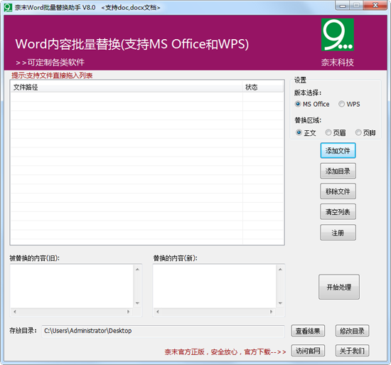 3.点击右侧“添加文件”按钮,导入doc/docx文件;或者直接拖入文件到软件列表中