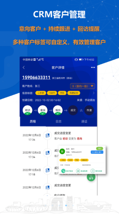 4、外呼智能辅助:自动拨号(拨号时弹框显示客户资料),通话结束随手标记,一键添加客户微信。