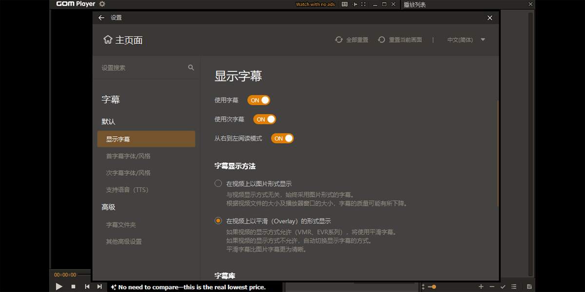 gom player支持 smi, srt, rt, sub格式的字幕. 用户可自定义字幕的位置、字体、大小等相关属性,支持卡拉ok模式,支持调整字幕时间