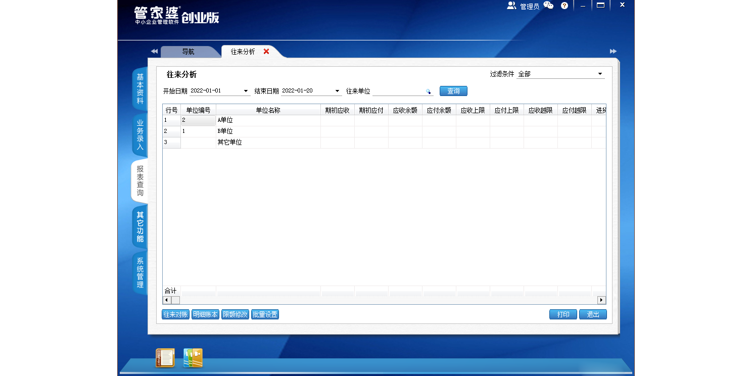 利润统计、往来分析、收支项目表、回款分析、结算账户查询