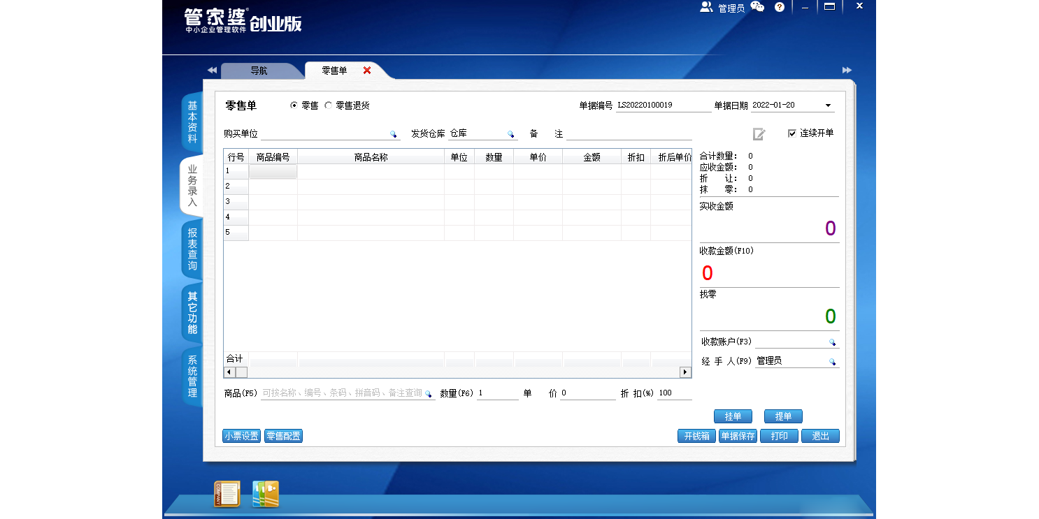 4.可以使用零售单进行pos操作,使零售、打印小票、收款一次完成。