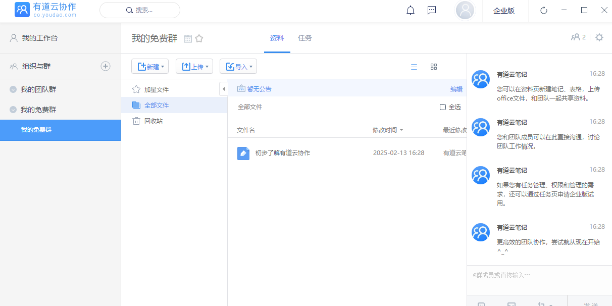 在有道云协作中,用户可以建立协作群,与团队成员共同管理资料、协同编辑、实时沟通和指派任务。有道云协作可以满足7*24小时不间断使用,降低公司的it成本,并提升团队的工作效率。