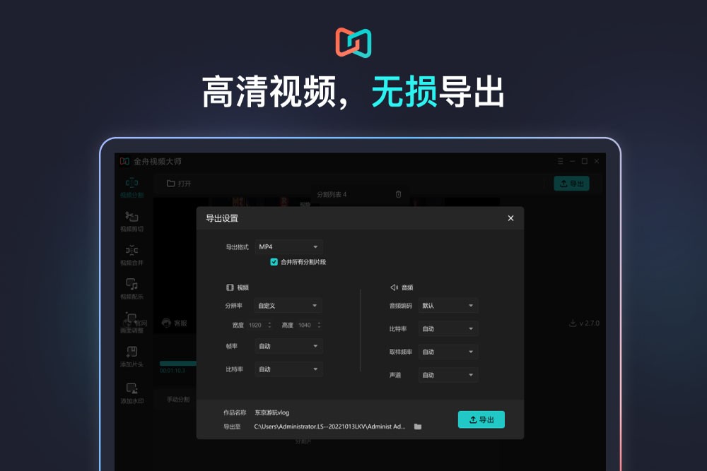 视频剪切、视频分割、视频合并、视频加水印、视频添加音乐合并、视频配乐、视频美化;金舟视频大师软件是一款简单易上手的视频剪切合并器,软件支持视频分割、视频合并;视频分割功能支持多段视频分割导出(支持手动精确输入需要截取的时间段)、视频画面任意截取、可自定义添加音频合成、视频配乐、画面调整、添加片头封面;为视频处理用户带来便利。